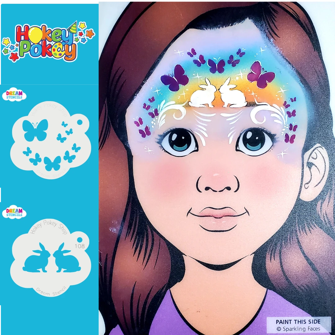 For best results load paint onto a face painting sponge or finger dauber with a tiny amount of water. Aim for a creamy consistency, leaning on the side of dry. If the paint is too wet, it can leak underneath the stencil. Hold the stencil tight to the skin, and dab the sponge on top of the design!