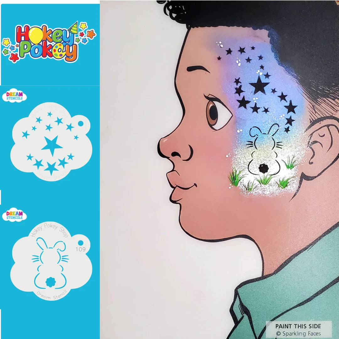 For best results load paint onto a face painting sponge or finger dauber with a tiny amount of water. Aim for a creamy consistency, leaning on the side of dry. If the paint is too wet, it can leak underneath the stencil. Hold the stencil tight to the skin, and dab the sponge on top of the design!