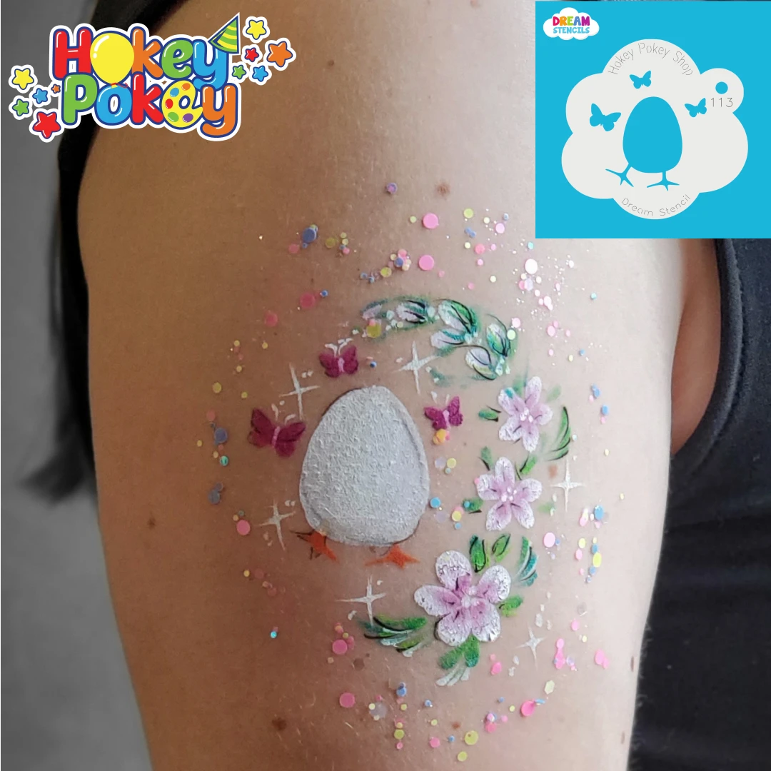For best results load paint onto a face painting sponge or finger dauber with a tiny amount of water. Aim for a creamy consistency, leaning on the side of dry. If the paint is too wet, it can leak underneath the stencil. Hold the stencil tight to the skin, and dab the sponge on top of the design!
