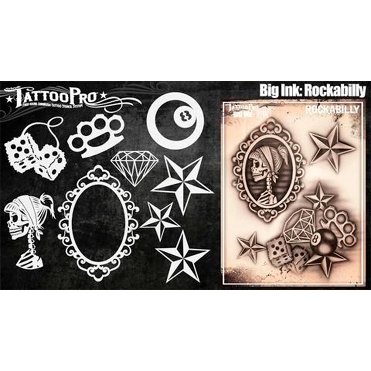 Big Ink: Rockabilly design sheet features 1 fuzzy dice, 1 brass kuncles, 1 8-ball, 3 sizes of nautical stars, 1 diamond, 1 large skull girl cameo that can be used to create realistic airbrush tattoos.