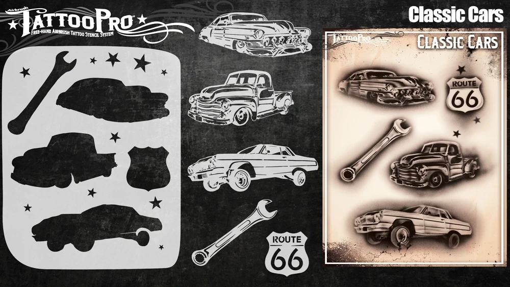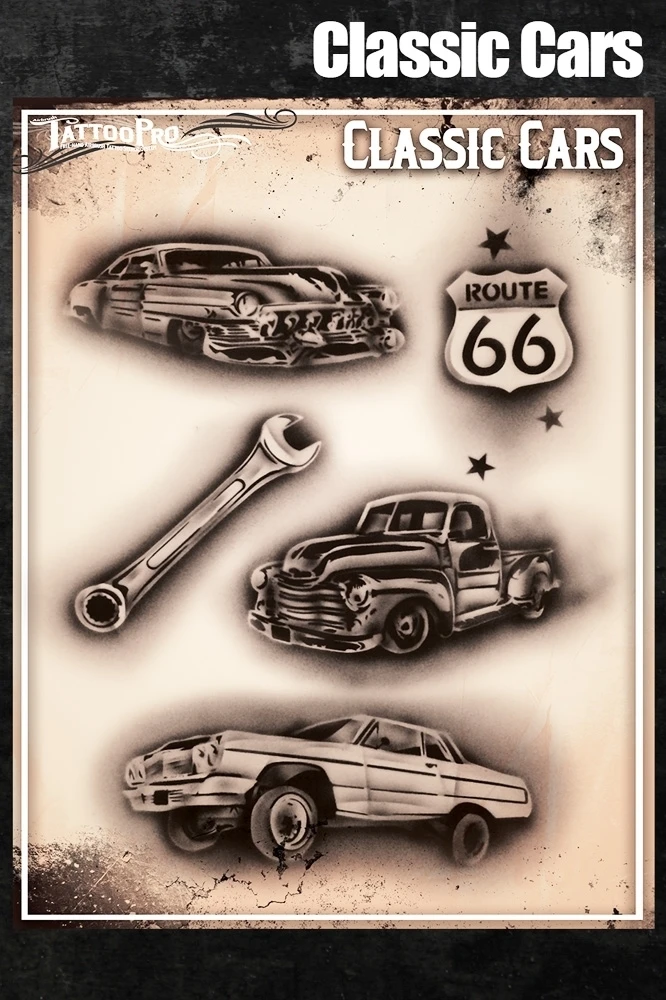 The Classic Cars design sheet features 3 Clsassic Automobile stencils, 1 Wrench stencil, 1 Route 66 stencil and other elements that can be used to make realistic airbrush tattoos.