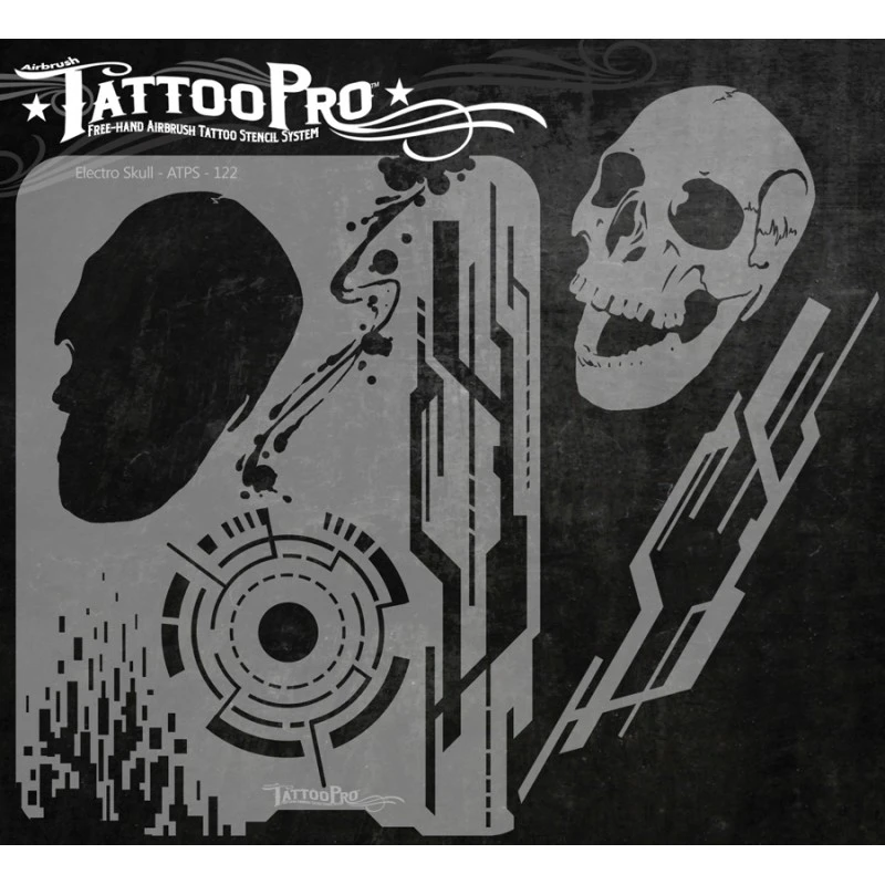 The Electro Skull design sheet features 1 new Skull stencil, Electric patterns and other elements used to create realistic airbrush tattoos.