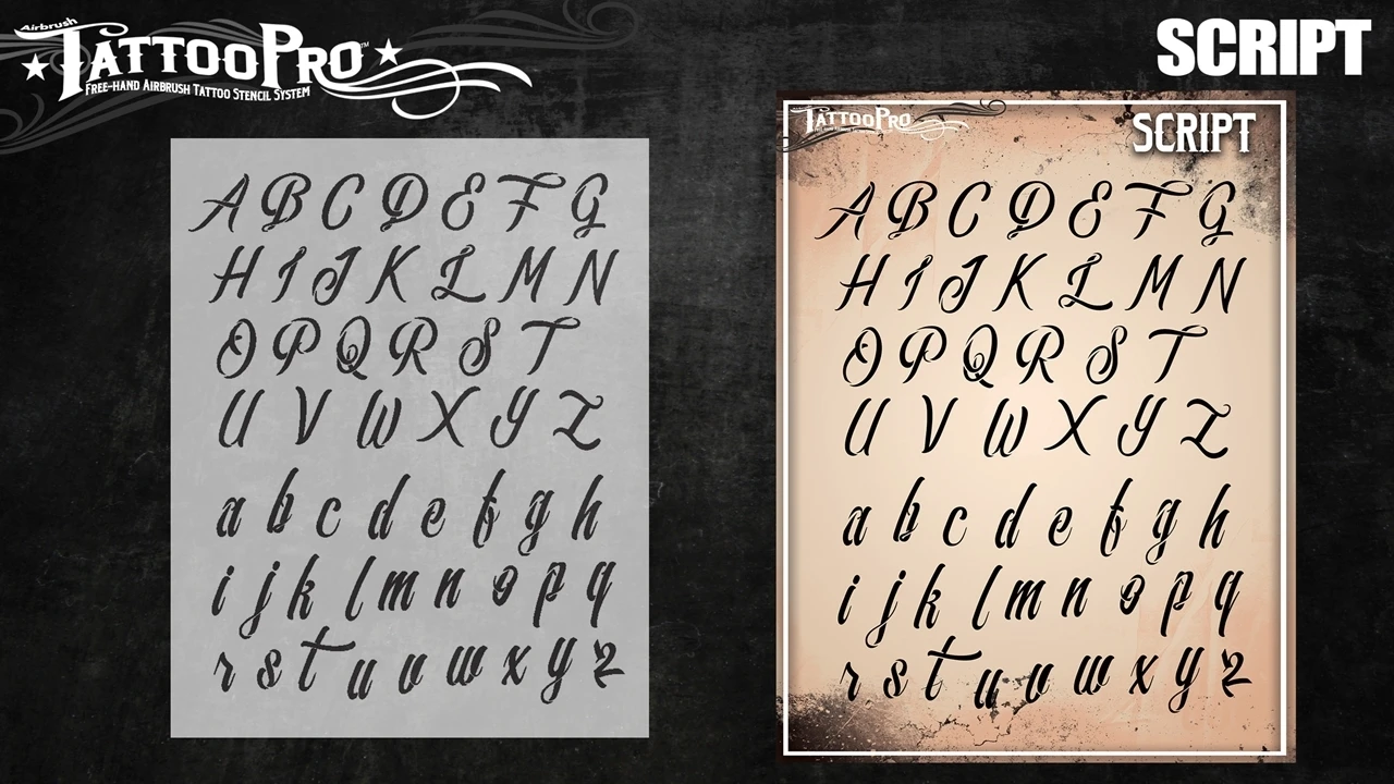 This Special Edition Stencil Kit contains an Upper and Lower case Tattoo font! It is the perfect stencil kit for people looking to have custom witting or script on their body. Clients will love the fact that you will be able to offer them the ability to write their special quote on their body.
