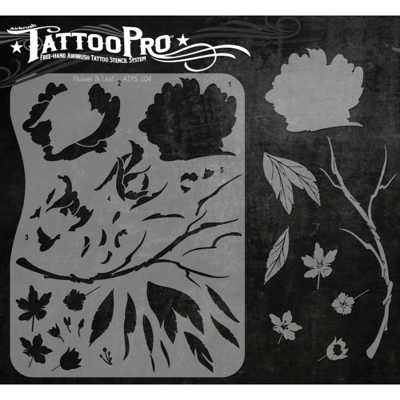 The Flower & Leaf design sheet features one large peony flower (5 steps), 4 small tree flowers, a branch, several leaf shapes and other elements that can be used to make realistic airbrush tattoos.