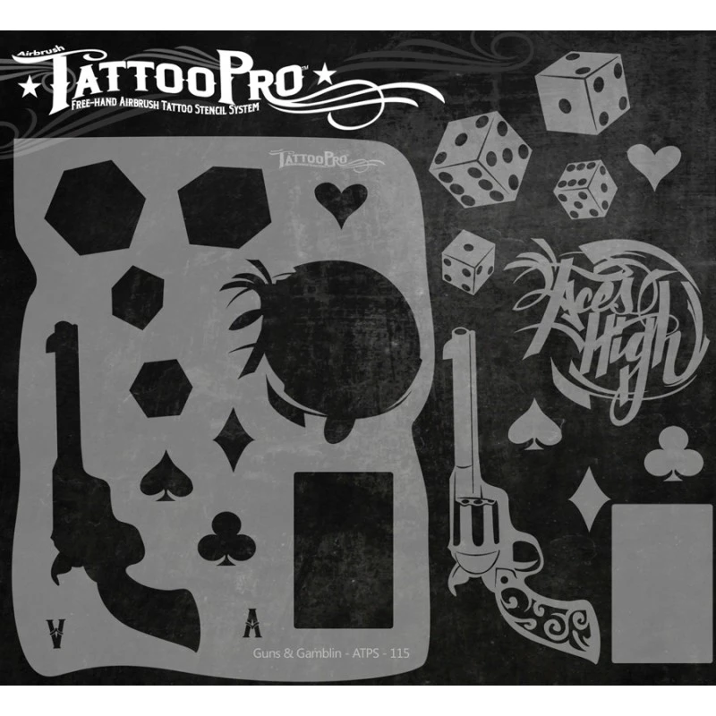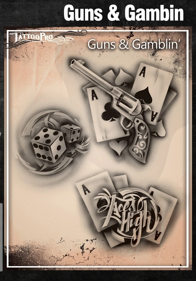 The Guns & Gamblin’ design sheet features 1 Western Revolver stencil, 2 Large Dice stencils, 2 Small Dice stencils, 1 Playing Card stencil, and 1 “Aces High” stencil and other elements used to create realistic airbrush tattoos.