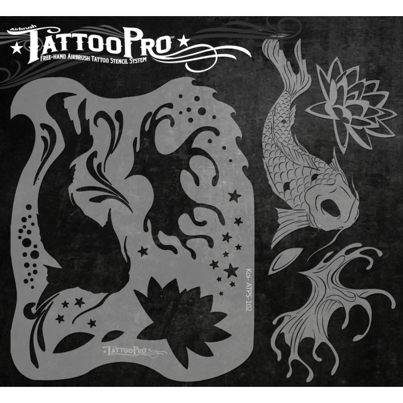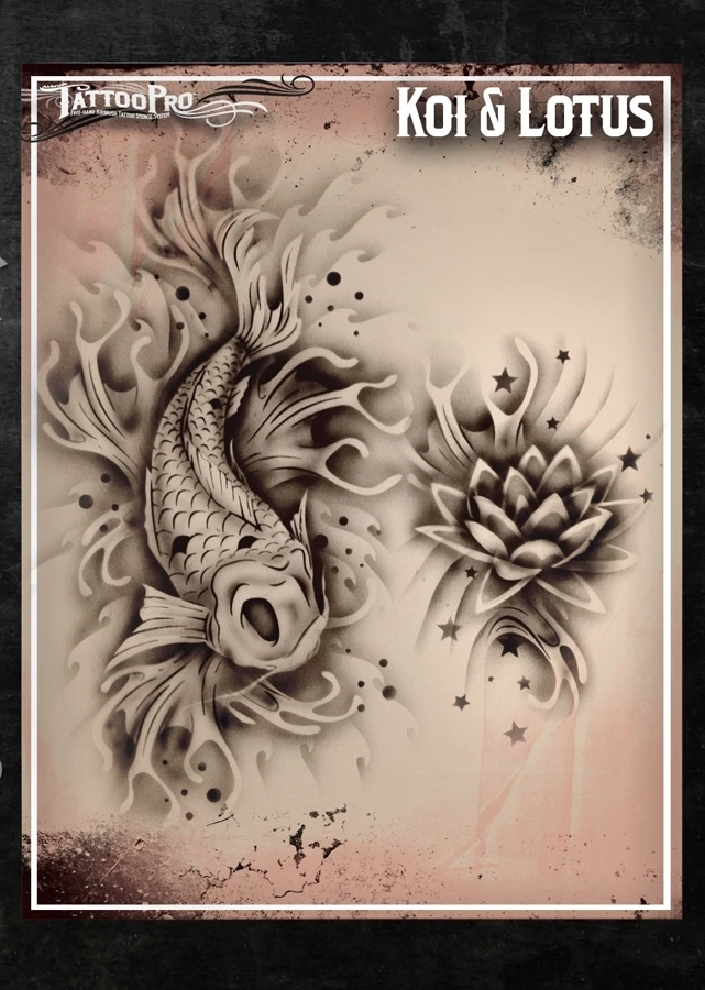 The Koi & Lotus design sheet features 1 highly detailed Japanese koi fish stencil, 1 splashing wave stencil for water backgrounds, 1 lotus stencil and other elements that can be used to make realistic airbrush tattoos.