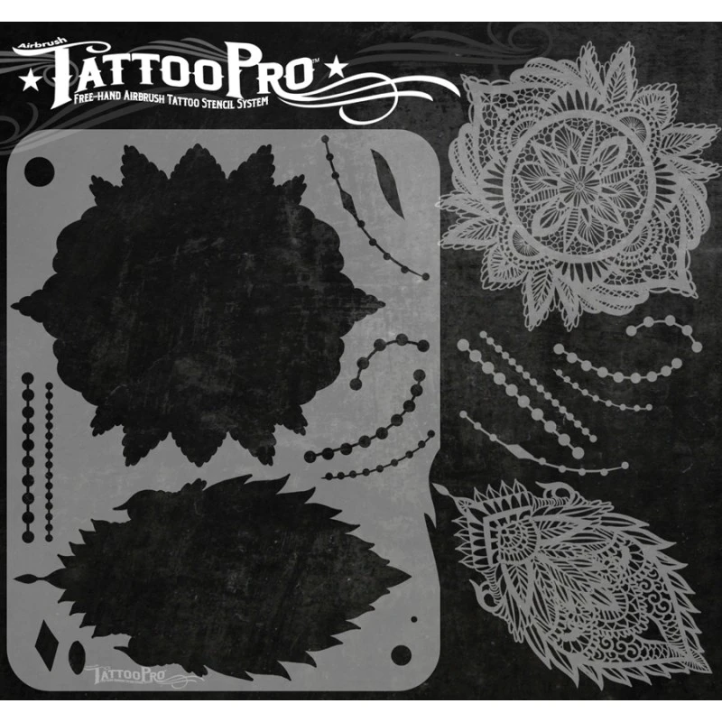 The Lace design sheet features 2 different Lace pattern stencils, and other elements used to create realistic airbrush tattoos.