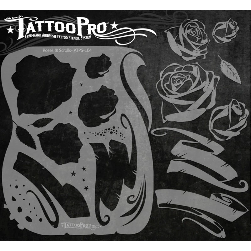 The Roses & Scrolls design sheet features 2 sizes full bloom rose stencils, 2 sizes rose bud stencils, 2 different types of scroll banner stencils and other elements that can be used to make realistic airbrush tattoos.