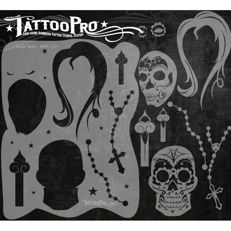 The Sugar Skulls design sheet features 1 Cavalera Sugar Skull stencil, 1 Female Sugar Skull stencil, 1 Rosary stencil, 1 Cross stencil, and other elements used to create realistic airbrush tattoos.