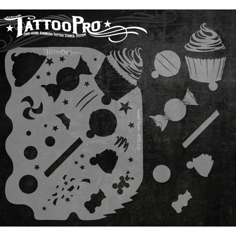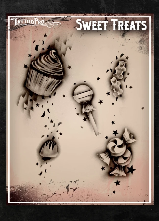 The Sweet Treats design sheet features 1 med sized Cupcake Frosting stencil, 1 med sized Cupcake Cup stencil, 1 small Wrapped Candy /w swirl, 1 small Lollipop, 1 small Bon Bon, Gummy Bear, Gumballs, Confetti and other elements that can be used to make realistic airbrush tattoos.