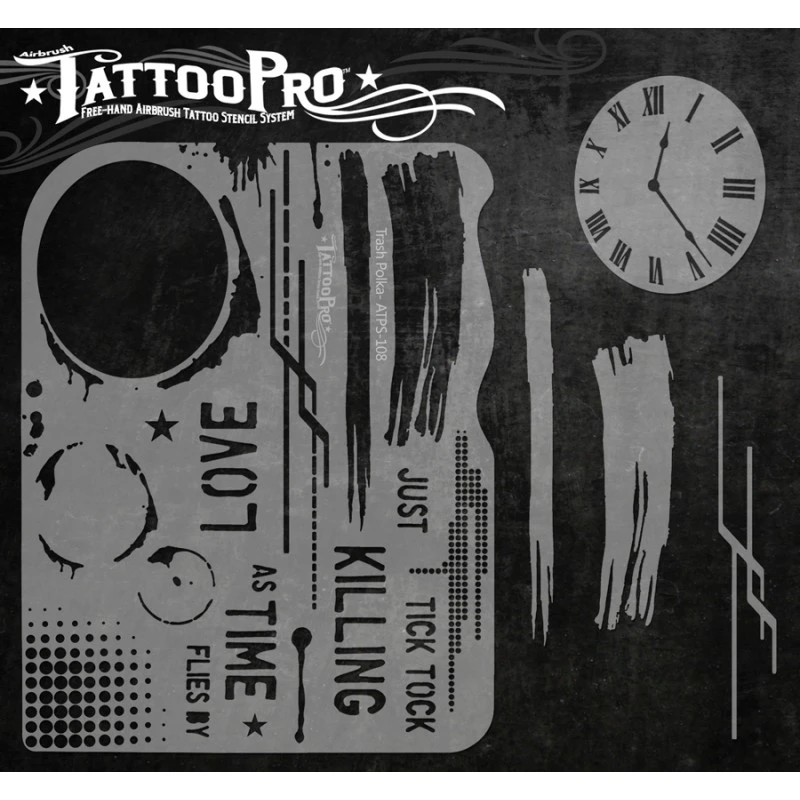 The Trash Polka design sheet features many Trash Polka tattoo design elements including Half Tone, 2 Grunge elements, Coffee ring elements, type letters spelling out words, line patterns, 1 large sized Clock stencil and other elements that can be used to make realistic airbrush tattoos.