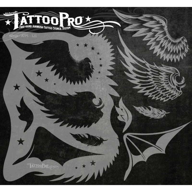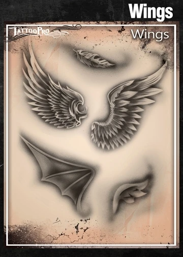 The Wings design sheet features 4 different Wing stencils, 1 Feather stencil and other elements used to create realistic airbrush tattoos.